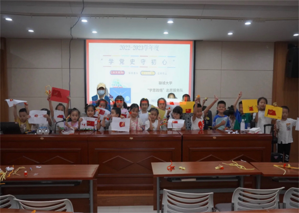 在宣讲完之后,团队负责人带领小朋友们进行手工创作,教会他们绘制党旗,并且进行扭扭棒手工创作,经过小朋友们的集体构思和巧手制作,在场的每位孩子都创作出属于自己的独特作品。